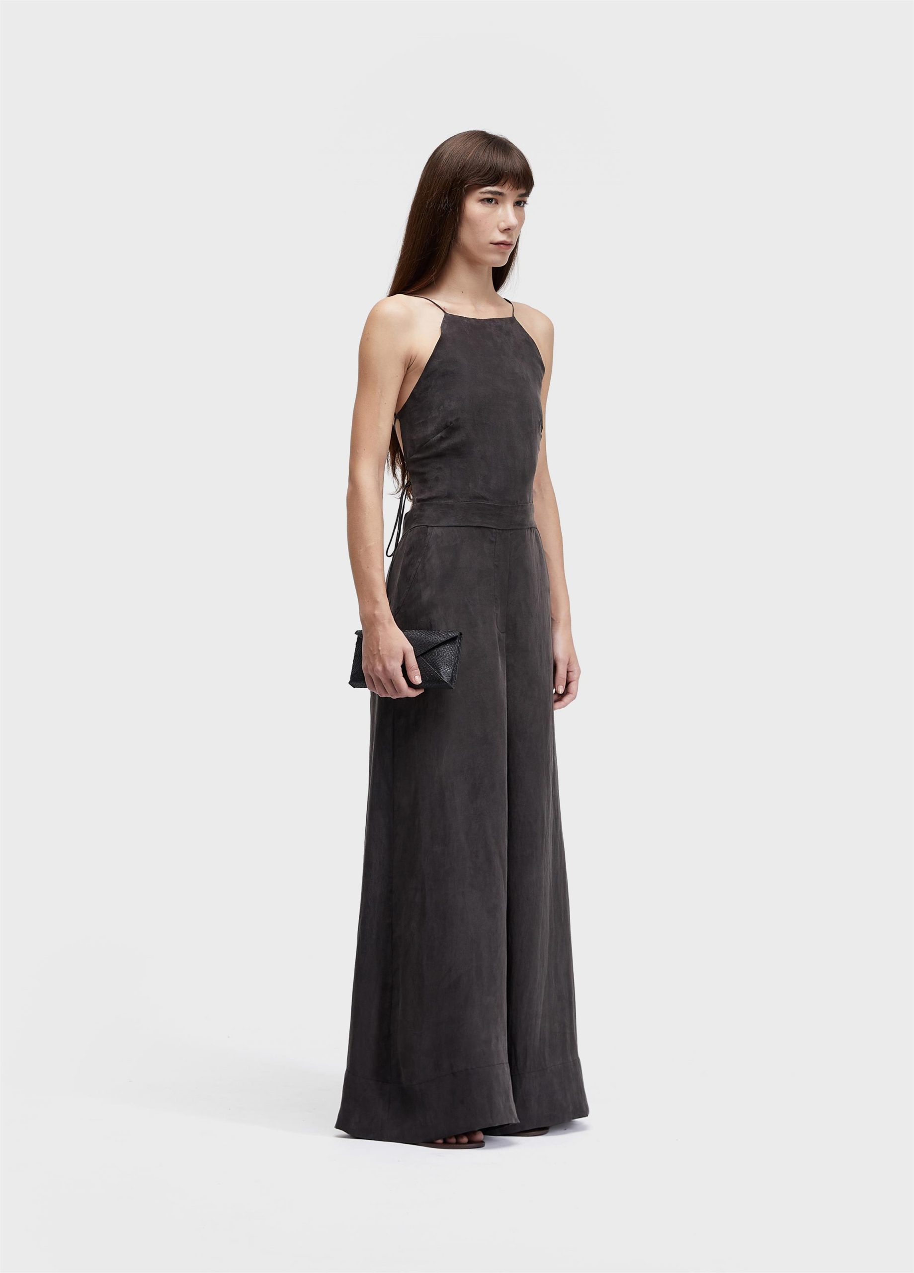 Macacão frente única feminino; 100% cupro; modelagem acinturada com bolsos frente e costas, amarração e abertura com zíper nas costas; caimento fluido